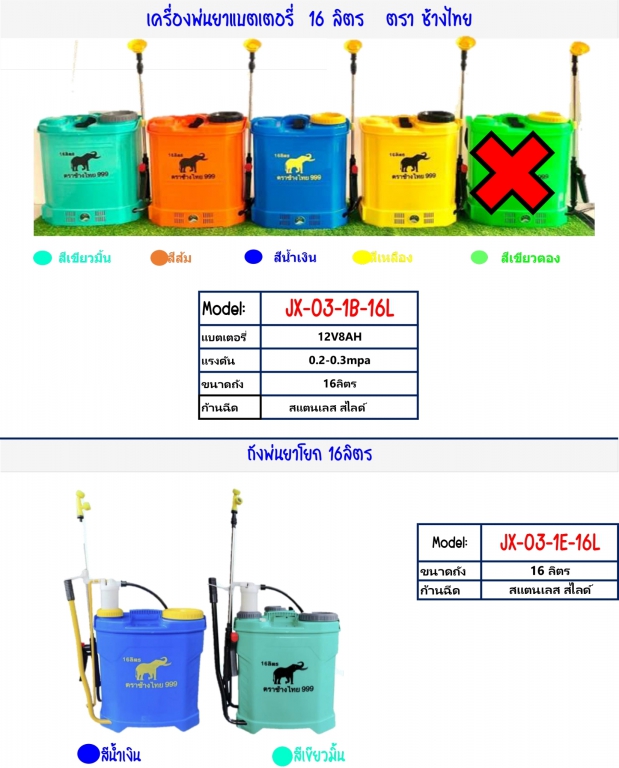 เครื่องพ่นยาแบตเตอรี่และถังพ่นยาโยก ขนาด 16 ลิตร ตราช้างไทย