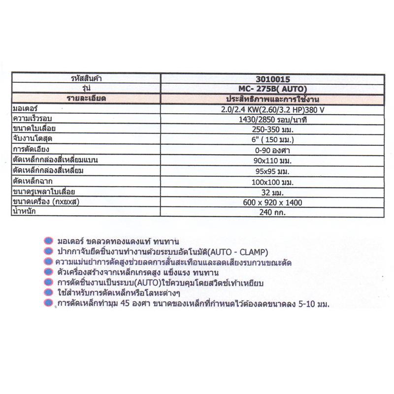 | Info | เครื่องตัดโลหะใบเลื่อยวงเดือน MC-275 B (AUTO) |
