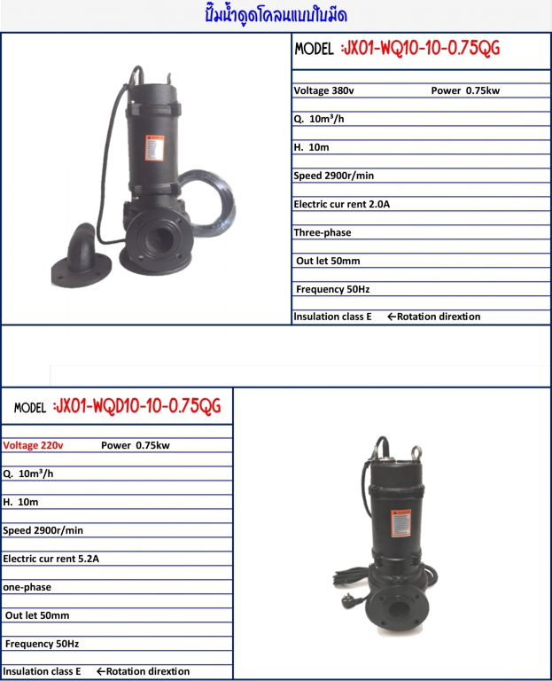 ปั๊มน้ำดูดโคลนแบบใบมีด Model :JX01-WQD10-10-0.75QG สินค้าได้ตามรูป