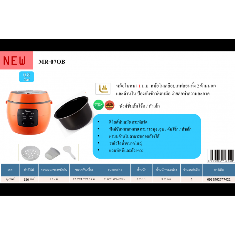 | ข้อมูล | หม้อหุงข้าว Midea MR-07OB 0.8 ลิตร |