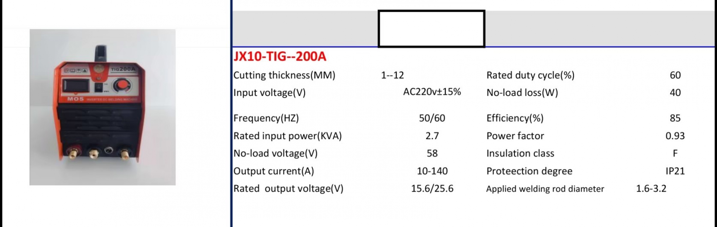 | ข้อมูล | Model JX10-TIG--200A |