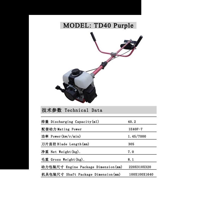 Name : Brush cutter ยี่ห้อ KINJAI หมายเหตุ : ราคาขายต่อ 4 เครื่อง Model : KJ-TD40 Engine Model : 1E40F5A Displacment(cc) : 40.2 Engine Perforance : 1250W Engine Type : 2 Stroke Caburetor : Pump-film type Carrying Type : Side-attached