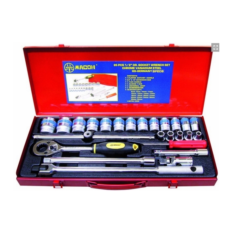 บล็อคชุด MACOH 26 ตัวชุด เยอรมัน ขอบน้ำเงิน รู 1/2" #100036/100037 **ประกอบด้วย ด้ามฟรี 10" ,ข้อต่อ 5", และ 10" ,ด้ามบล็อค 15" ,ด้ามเลื่อน 10 " ,ข้ออ่อน ไขควงหัวสลับ ลูกบล็อค ขนาด 8 ,9 ,10 ,11 ,12 ,13 ,14 ,17 ,18 ,19 ,20 ,21 ,22 ,23 ,24 ,26 ,30 ,31 mm.
