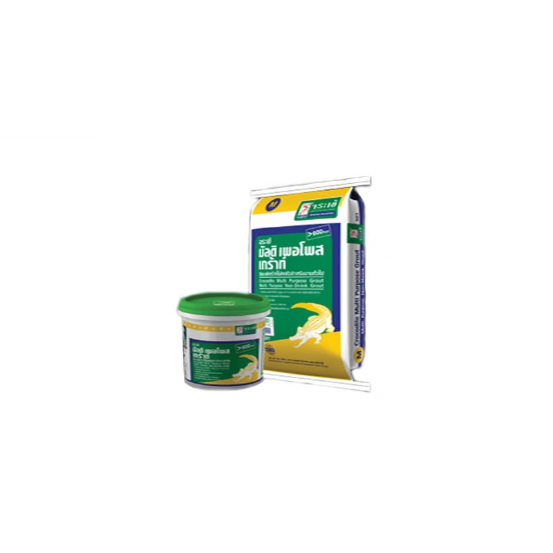 ซีเมนต์เกร้าท์ชนิดไม่หดตัว สำหรับงานทั่วไป เป็นปูนเกร้าท์ผสมเสร็จ ไม่หดตัว รับแรงอัดสูง มีส่วนประกอบ ของทรายละเอียด ปูนซีเมนต์ปอร์ตแลนด์ และเคมีผสมเพิ่มอื่นๆ เหมาะสำหรับงานเกร้าท์ทั่วไป ช่องว่างแคบๆ ใช้เป็นฐานรองรับส่วนโครงสร้างต่างๆรวมถึงคาน เสา ผนังคอนกรีตเสริมเหล็ก สำเร็จรูป หรือจะใช้สำหรับงานเกร้าท์กรอบประตูระหว่างกำแพง หรือตามส่วนงานโครงสร้างต่างๆ คุณสมบัติเด่น รับกำลังอัดได้สูง มากกว่า 600 ksc มีการไหลตัวดี เนื้อละเอียด สามารถใช้งานในส่วนพื้นที่แคบๆได้ สามารถใช้กับเครื่องปั้มได้ สามารถผสมหินเกล็ดเพื่อเพิ่มความหนาได้ มาตรฐาน : ASTM C109, C192, C232, C807, C827 ข้อแนะนำการใช้งาน การเตรียมพื้นผิว ทำพื้นผิวให้หยาบโดยการสกัดหรือขัด เพื่อเพิ่มประสิทธิภาพการยึดเกาะ ทำความสะอาดพื้นผิว ขจัดสิ่งสกปรก ฝุ่น นํ้ามัน และเศษคอนกรีตออกจากบริเวณที่จะทำงาน เตรียมแบบสำหรับหล่อคอนกรีตจะต้องแข็งแรงพอและทำการอุดร่องเพื่อป้องกันการรั่วไหลของปูนเกร้าท์ ควรบ่มผิวคอนกรีตให้เปียกชุ่ม และดูดซับนํ้าส่วนเกินที่ค้างบนผิวงานออกให้หมดก่อนใช้งาน การผสม ทำความสะอาดเครื่องผสมและราดนํ้าให้เปียกชุ่ม ตวงนํ้าใส่ในภาชนะที่จะผสม เปิดเครื่องผสม และค่อยๆเติมปูนเกร้าท์ลงไป ผสมต่อเนื่องกันนานประมาณ 2 นาที จนเข้าเป็นเนื้อเดียวกัน ในกรณีส่วนที่ต้องการเกร้าท์มีความหนาเกิน 3 นิ้ว ควรใส่ หินเกล็ดขนาดไม่เกิน 3/8 นิ้ว (9 มม.) ในอัตราส่วนร้อยละ 25-50 % โดยนํ้าหนัก (5-10 กก. ต่อ ปูนเกร้าท์ 20 กก.) และเพิ่มระยะเวลาการผสม เพื่อให้ปูนเกร้าท์มีความหนืดที่ สามารถเทได้ ควรผสมในปริมาณน้อย เพื่อใช้ให้หมดภายใน 30 นาที และ ไม่ควรนำส่วนผสมมาเติมนํ้า แล้วนำกลับมาใช้อีก การใช้งาน ควรเทหรือฉีดปูนเกร้าท์จากเครื่องฉีดลงใต้โครงสร้างหรือแบบจากด้านใดด้านหนึ่งของแบบที่เตรียมไว้ เพื่อป้องกันไม่ให้เกิดโพรงอากาศ และควรเทต่อเนื่องกันจนเต็ม ควรขจัดโพรงอากาศด้วยวิธีการกระทุ้ง เพื่อให้วัสดุเติมเต็มช่องว่างได้ ควรทำการเทเป็นชั้น โดยแต่ละชั้นทิ้งช่วงห่างกันประมาณ 24 ชั่วโมง การบ่ม ควรทำการบ่มปูนเกร้าท์ด้วยนํ้าอย่างน้อย 3 วัน ป้องกันไม่ให้ผิวงานสั่นสะเทือน ถูกความร้อนหรือความเย็นที่รุนแรง อัตราการใช้งาน จระเข้ มัลติ เพอโพส เกร้าท์ 1 ถุง (20 กก.) / 0.011 ลบ.ม. จระเข้ มัลติ เพอโพส เกร้าท์ 91 ถุง (20 กก.) / ลบ.ม. ข้อควรระวัง ควรใช้อุปกรณ์ป้องกันความปลอดภัยต่างๆ เช่น ถุงมือ หน้ากากกันฝุ่น แว่นตา ฯลฯ ถ้าถูกหรือสัมผัสกับผิวหน้าให้ใช้น้ำและสบู่ล้างทำ ความสะอาด ในกรณีเข้าตาให้ล้างตาด้วยน้ำสะอาด ห