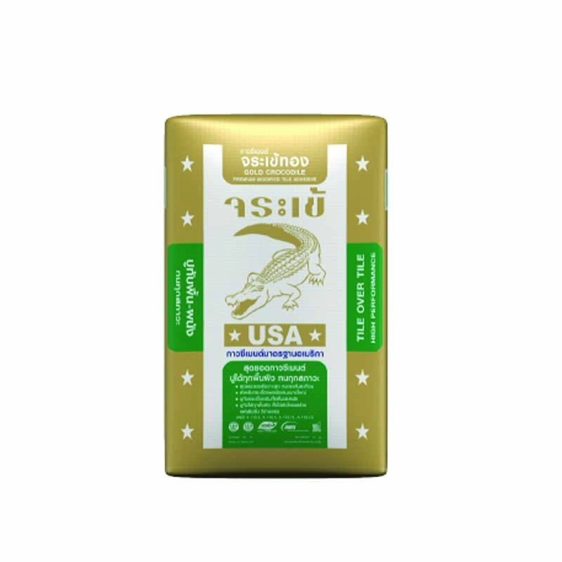 สุดยอดกาวซีเมนต์ ปูได้ทุกพื้นผิว* ทนทุกสภาวะ สุดยอดแรงยึดเกาะสูง ทนแรงสั่นสะเทือน สำหรับกระเบื้องพอร์ซเลนขนาดใหญ่ ปูทับกระเบื้องเดิมทั้งพื้นและผนัง ปูได้ทุกพื้นผิว* ทั้งไม้อัดโครงสร้าง แผ่นยิปซั่ม วีว่าบอร์ด ** ควรใช้คู่กับกาวยาแนวจระเข้ ------------------------------------------------------------------------------- กาวซีเมนต์จระเข้ทอง มีส่วนผสมของปูนซีเมนต์ปอร์ตแลนด์, ทราย,ผงลาเท็กซ์ที่เพิ่มประสิทธิภาพของกาวซีเมนต์ให้ดีขึ้น และเคมีผสมเพิ่มชนิดพิเศษอื่นๆ ทำให้ผลิตภัณฑ์มีคุณสมบัติที่ให้การยึดเกาะสูง มีการยืดหยุ่นที่ดี ทนทานในทุกสภาพภูมิอากาศ ใช้ปูทับกระเบื้องเดิม และปูกระเบื้องได้ทุกชนิด -------------------------------------------------------------------------------- คุณสมบัติเด่น กาวซีเมนต์คุณภาพสูง ชนิดยืดหยุ่นยึดเกาะสูงพิเศษ ทนแรงสั่นสะเทือน ใช้ปูกระเบื้องเซรามิคได้ทุกขนาด ทุกชนิด, ปูหินอ่อน, ปูหินแกรนิต, ปูโมเสคแก้ว, กระเบื้องแก้ว ใช้ปูได้ทั้งพื้น-ผนัง, ภายใน-ภายนอก ทนต่อทุกสภาวะอากาศ ใช้ปูทับกระเบื้องเดิมทั้งพื้นและผนัง โดยไม่ต้องสกัดออก สามารถใช้ปูบนพื้นผิวไม้อัดโครงสร้าง, แผ่นซีเมนต์ไม้อัด* การเตรียมพื้นผิว พื้นที่ต้องการปูกระเบื้องต้องสะอาด ปราศจากฝุ่น, น้ำมัน, น้ำยาบ่มคอนกรีต, สี, เศษปูน และสิ่งแปลกปลอมอื่นๆ ล้างทำความสะอาดพื้นผิวโดยใช้น้ำฉีด ขัดพื้นผิวให้สะอาด และกวาดน้ำที่ขังบนพื้นผิวให้หมดก่อนที่ใช้กาวซีเมนต์ อัตราส่วนผสม กาวซีเมนต์ จระเข้ทอง 20 กิโลกรัม ต่อน้ำ 5.5 ลิตร หรือ ปูน 2.5 ส่วน ต่อ น้ำ 1 ส่วน โดยปริมาตร การผสม เทปูนกาวซีเมนต์ลงในน้ำในขณะที่เปิดเครื่องผสม รอบต่ำประมาณ 150 รอบต่อนาที (150 rpm) ผสมให้เข้ากันดี หลังจากผสมแล้วควรใช้งานให้หมด ภายใน 20-30 นาที(ขึ้นกับอุณหภูมิ) อย่าเติมน้ำหรือกาวซีเมนต์ลงไปอีกหลังจากเคมีบ่มตัวแล้ว การใช้งาน ใช้เกรียงหวีด้านเรียบปาดกาวซีเมนต์ลงบนพื้นหรือผนังที่ต้องการปูกระเบื้อง ให้เพียงพอสำหรับกระเบื้องที่จะใช้ปูแต่ละครั้ง ใช้ด้านหวีปาดเป็นร่องให้ทั่ว และครูดให้เป็นรอยทาง ตามตารางการใช้งาน นำกระเบื้องปูบนกาวซีเมนต์ เคาะกระเบื้องให้ติดแน่นกับกาวซีเมนต์ กดกระเบื้องลงบนกาวซีเมนต์ควรแน่ใจว่าหลังกระเบื้องสัมผัสกับกาวซีเมนต์เต็มแผ่น สามารถจัดกระเบื้องแต่ละแผ่นให้ตรงแนวตามต้องการภายในเวลาไม่เกิน 15 นาที ก่อนกาวปูกระเบื้องจะแห้งสนิทและไม่ควรจัดหรือเคาะกระเบื้องอีกเมื่อเลยเวลาดังกล่าว การบ่ม และการยาแนวกระเบื้อง หลังจากปูกระเบื้องเสร็จแล้ว ควรบ่มไว้ประมาณ 24 ชั่วโมง** ซึ่งขึ้นอยู่กับอุณหภูมิ จึงจะยาแนวกระเบื้อง เพื่อให้ได้งานที่มีคุณ