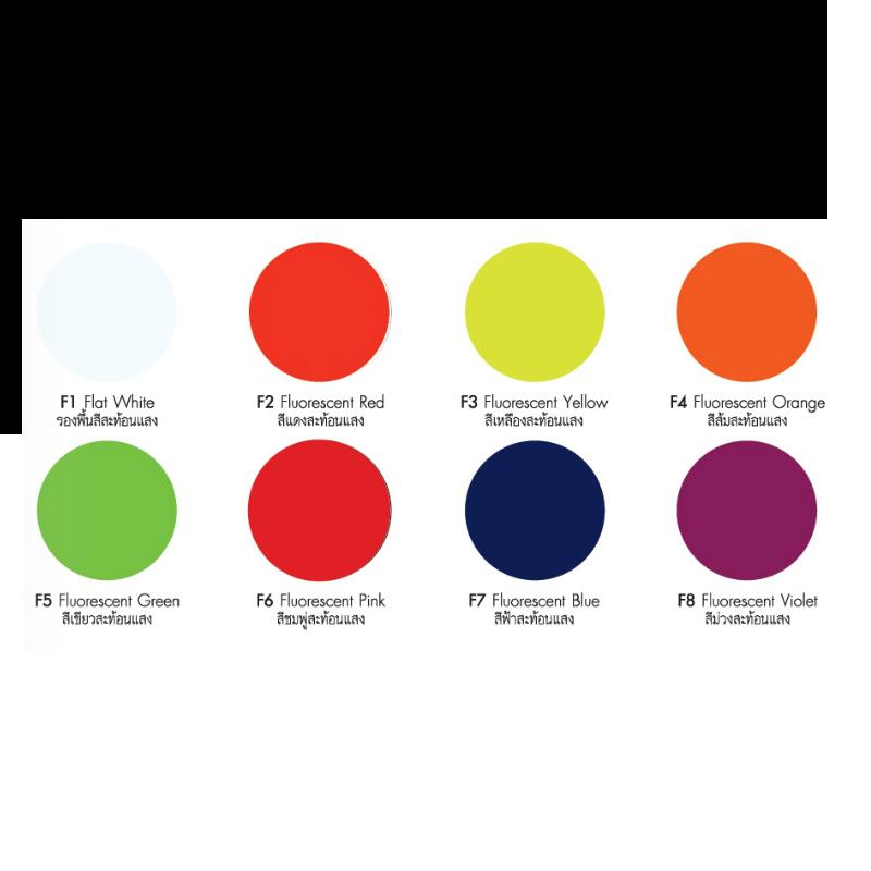 สีสเปรย์ สีธรรมดา สีสเปรย์ สีสะท้อนแสง สีสเปรย์ สีแคนดี้ โทน (สีโปร่งแสง) สีสเปรย์ สีคุณภาพเกรดพิเศษ สีสเปรย์ สีทนความร้อน 600 องศาเซลเซีย สีสเปรย์ สี่พ่นใต้ทองรถกันสนิม และเสียง 600 cc คำแนะนำในการใช้ 1. พื้นผิวที่พ่นต้องสะอาด แห้ง ปราศจากสนิม ฝุ่น และ คราบไขมัน 2. ก่อนใช้เขย่าสีที่กระป๋องให้ทั่วประมาณ 2 นาที จนเสียงลูกแก้วในกระป๋องดังสม่ำเสมอ ในขณะพ่น ควรเขย่ากระป๋องเป็นระยะๆ 3. พ่นให่ห่างจากสิ่งที่พ่นประมาณ 1 ฟุต 4. เพื่อให้ได้ชิ้นงานที่ดีควรพ่น 2 ครั้ง ครั้งแรกบางๆ ปล่อยให้แห้งประมาณ 10 นาที แล้วจึงพ่นทับอีกครั้ง 5. เมื่อใช้งานเสร็จ ก่อนจะเก็บกระป๋องสเปรย์ ควรล้างหัวพ่นโดยคว่ำกระป๋องลง กดที่หัวฉีดพ่นลมเปล่าๆออกเล็กน้อย คำเตือน อย่าพ่นใกล้เปลวไฟ อย่าเก็บในที่อากาศรอนกว่า 40 ซ ควรพ่นในที่อากาศถ่ายเทสะดวก เมื่อใช้หมดห้ามเผา หรือโยนกระป๋องเข้าเตาไฟ