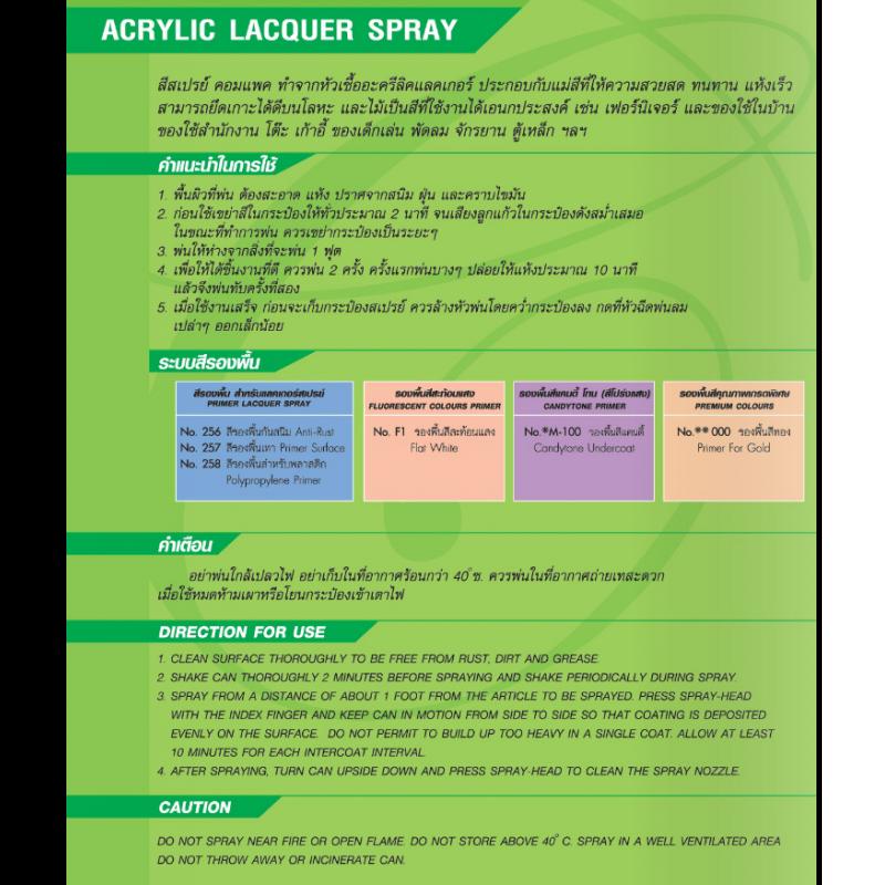 สีสเปรย์ สีธรรมดา สีสเปรย์ สีสะท้อนแสง สีสเปรย์ สีแคนดี้ โทน (สีโปร่งแสง) สีสเปรย์ สีคุณภาพเกรดพิเศษ สีสเปรย์ สีทนความร้อน 600 องศาเซลเซีย สีสเปรย์ สี่พ่นใต้ทองรถกันสนิม และเสียง 600 cc คำแนะนำในการใช้ 1. พื้นผิวที่พ่นต้องสะอาด แห้ง ปราศจากสนิม ฝุ่น และ คราบไขมัน 2. ก่อนใช้เขย่าสีที่กระป๋องให้ทั่วประมาณ 2 นาที จนเสียงลูกแก้วในกระป๋องดังสม่ำเสมอ ในขณะพ่น ควรเขย่ากระป๋องเป็นระยะๆ 3. พ่นให่ห่างจากสิ่งที่พ่นประมาณ 1 ฟุต 4. เพื่อให้ได้ชิ้นงานที่ดีควรพ่น 2 ครั้ง ครั้งแรกบางๆ ปล่อยให้แห้งประมาณ 10 นาที แล้วจึงพ่นทับอีกครั้ง 5. เมื่อใช้งานเสร็จ ก่อนจะเก็บกระป๋องสเปรย์ ควรล้างหัวพ่นโดยคว่ำกระป๋องลง กดที่หัวฉีดพ่นลมเปล่าๆออกเล็กน้อย คำเตือน อย่าพ่นใกล้เปลวไฟ อย่าเก็บในที่อากาศรอนกว่า 40 ซ ควรพ่นในที่อากาศถ่ายเทสะดวก เมื่อใช้หมดห้ามเผา หรือโยนกระป๋องเข้าเตาไฟ