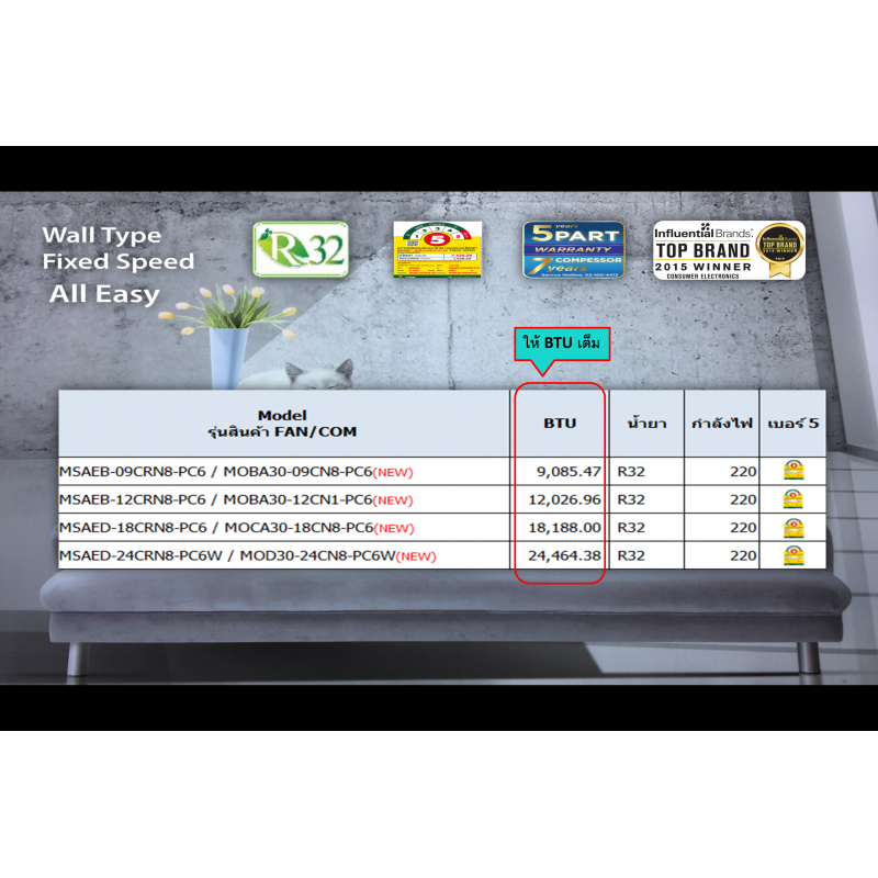 หมวดหมู่ : เครื่องใช้ไฟฟ้าและของในบ้าน / เครื่องใช้ไฟฟ้า / เครื่องปรับอากาศ